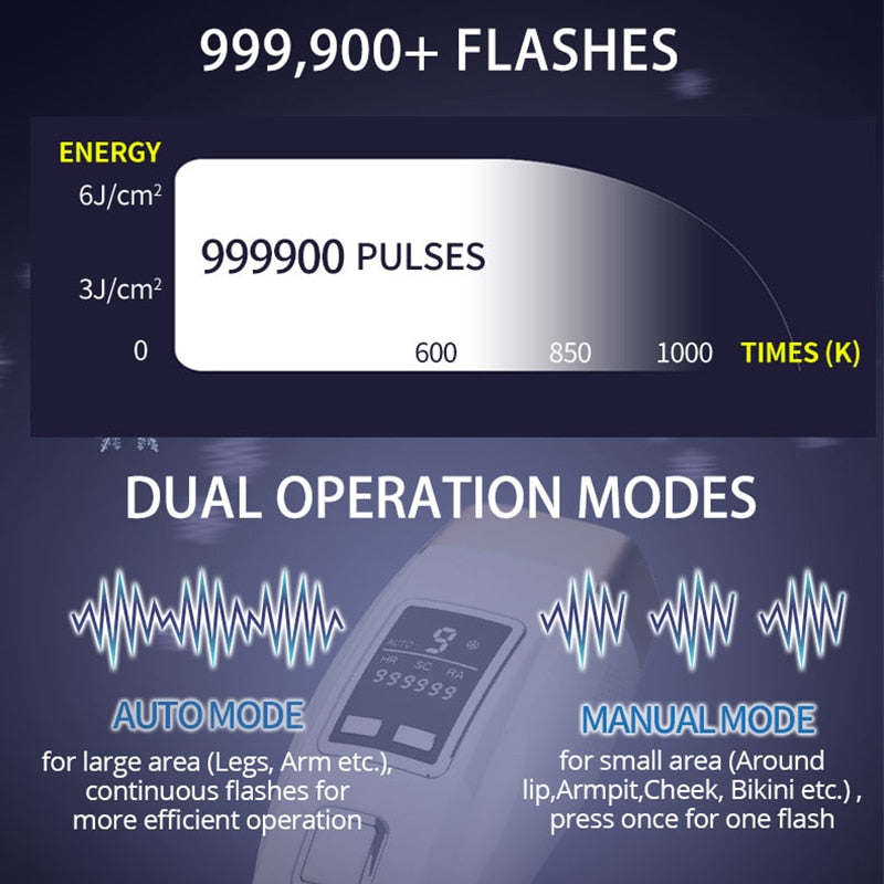 9 ENERGY LEVELS: The light power is more finely divided into 9 levels so that to suit the different skin sensibility more accurately.
